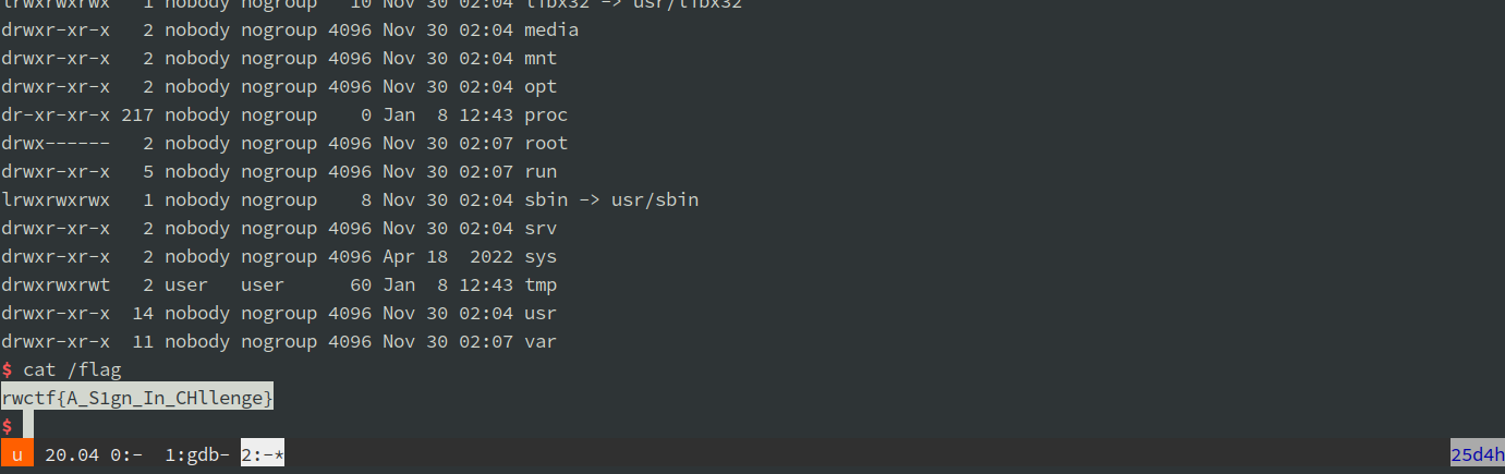 远程环境 libc 版本是 2.35。这里使用的 getshell 方法是修改 libc.so GOT 表,触发 malloc_printerr()报错执行 one gadget。