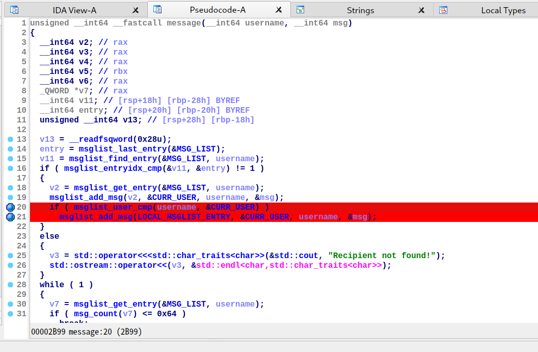 第二处漏洞是 read 里面的 double free,对应上图的第 29 行至第 34 行。简单来说只要 LOCAL_MSGLIST_ENTRY 里面的 message 满足两个条件(收件人和发件人为同一人且用户名长度大于 0x64),就能释放 message 指针,同样没有清空释放后的指针。
